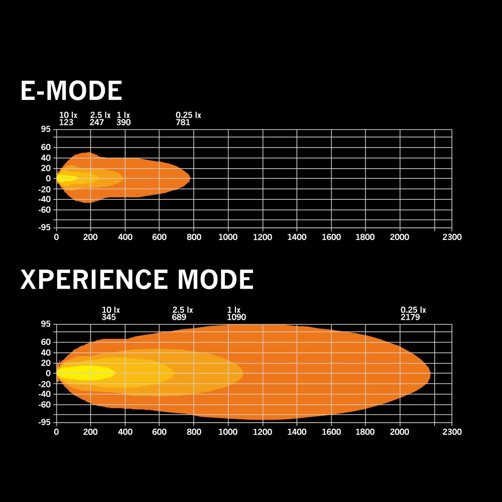 Effektförbrukning: X-mode 338 W, E-mode 76 W, vit pos. 13 W, amber pos. 13 W