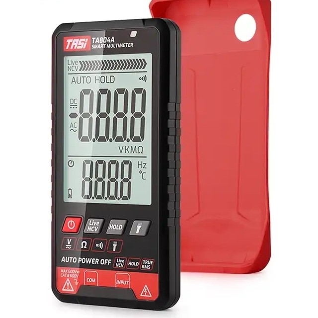 TASI TA804A er et smart multimeter som gjør jobben enklere ved å kjenne igjen hva du måler og automatisk bytte mellom AC, DC, resistans og frekvens. Dette lar deg fokusere på arbeidet uten å vri på noen brytere. Den store skjermen på 3,5 tommer viser både digitale verdier og en rask analog stolpe som gir en tydelig følelse av endringer i signalet. Et avtagbart beskyttelsesskall og en sterk LED-spotlight gjør den praktisk å bruke på trange eller mørke steder.